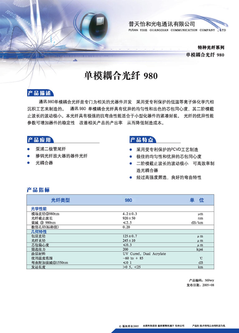 產(chǎn)品資訊 >> 光纖產(chǎn)品 >>單模藕合光纖980